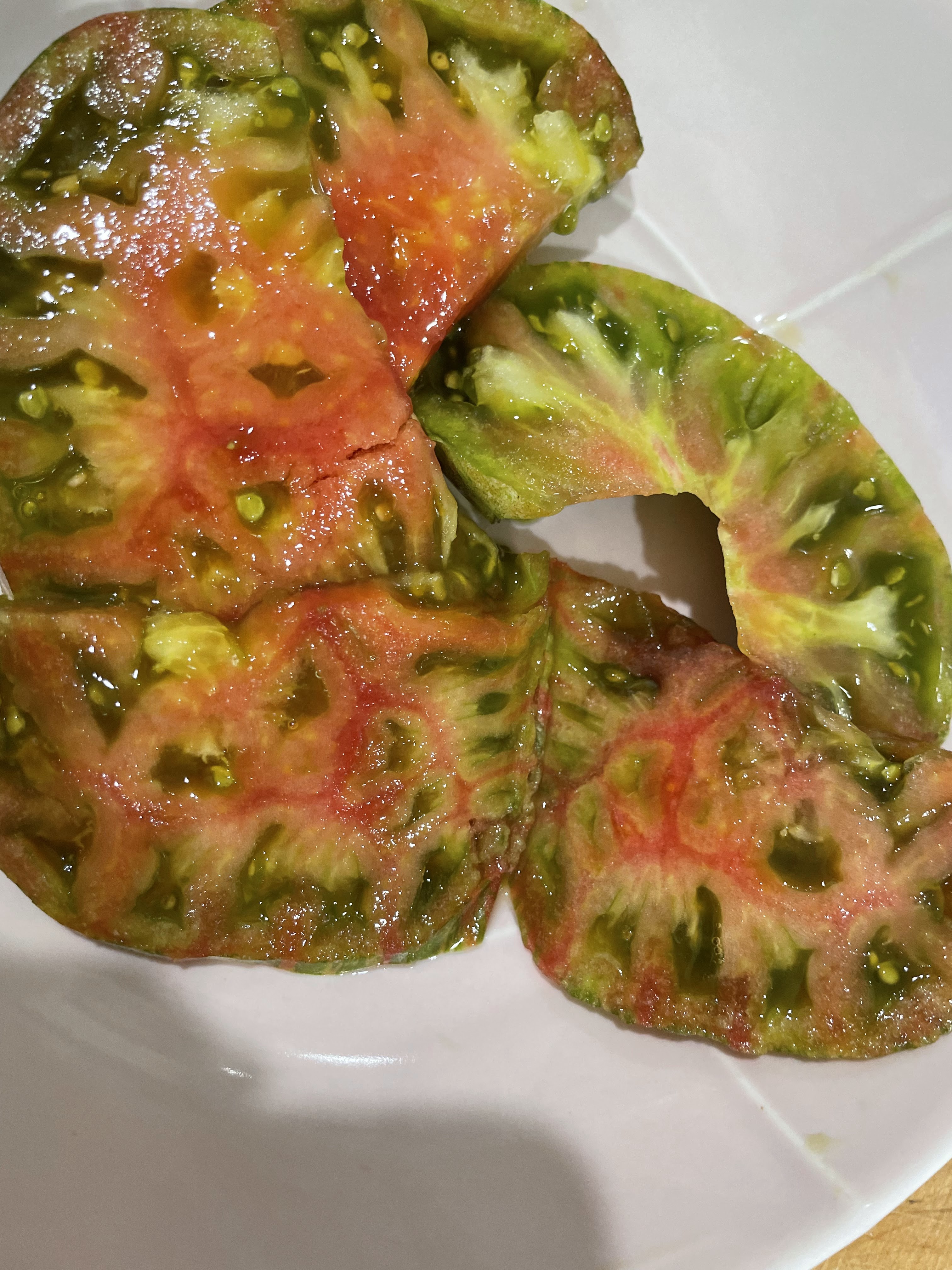 Believe it or not I have one last tomato on the vine. It's a Berkeley tie dye beefsteak tomato. I planted it new last February and it gave me a beautiful production but then it reseeded and gave me another huge crop starting in October